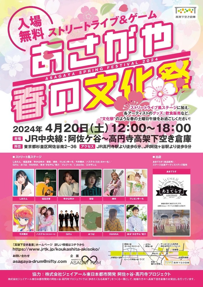 あさがや春の文化祭 SCHEDULE 2024/04/20(土) 12:00 - 18:00 阿佐ヶ谷~高円寺高架下空き倉庫 地図を表示 12:00~18:00 観覧無料 出演:しおたん/福島清香/ゆかはゆか/斐梨/璃咲/クレヨンゆーち/今井舞衣/ハステル/Gifts/みつば/HANNA/傘木"かさやん"亮介 出店:あまてらす URLをコピーする 報告する